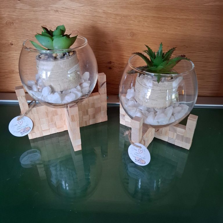Holzgestell mit Kugelglas, Steinen und Sukkulente